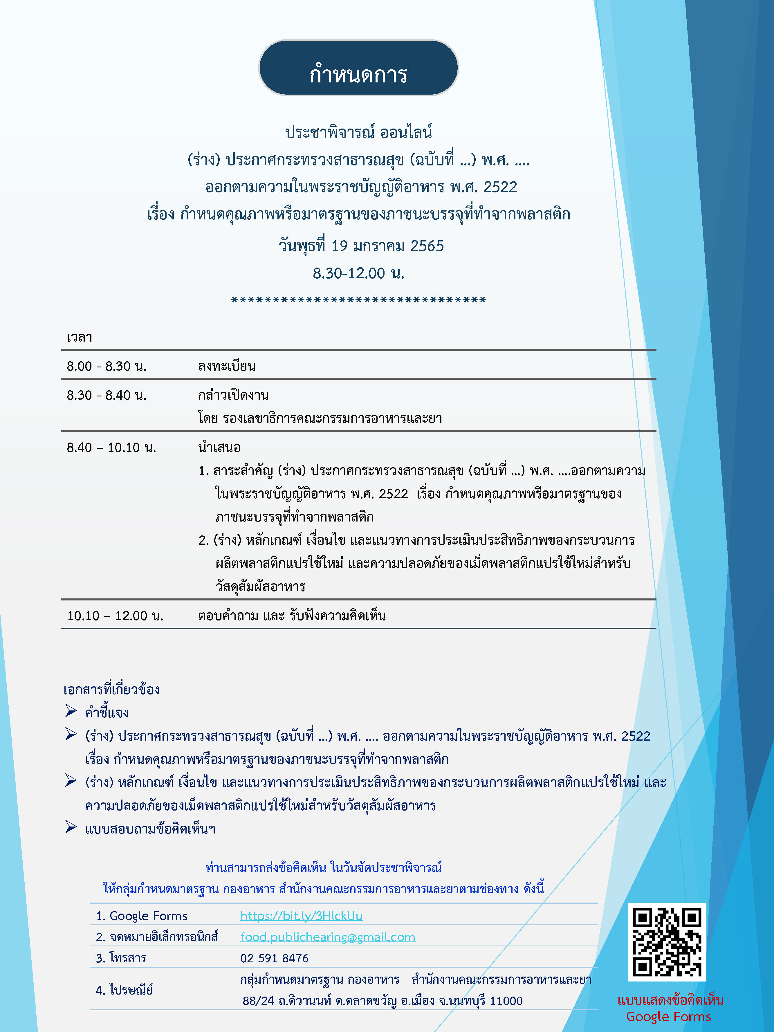 ด้วยสำนักงานคณะกรรมการอาหารและยา มีกำหนดจัดประชุมรับฟังความเห็นต่อร่างประกาศกระทรวงสาธารณสุขว่าด้วยกำหนดคุณภาพหรือมาตรฐานของภาชนะบรรจุที่ทำจากพลาสติก ในวันพุธที่ 19 มกราคม 2565 เวลา 8.30-12.00 น. ผ่านทางสื่ออิเล็กทรอนิกส์ โดยโปรแกรม Zoom