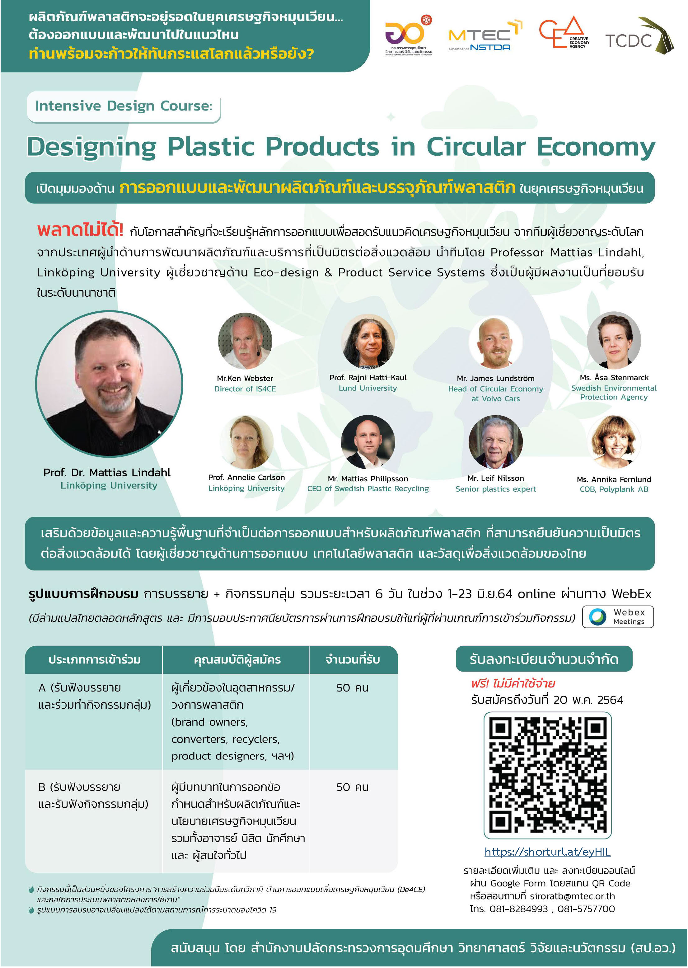 สำนักงานพัฒนาวิทยาศาสตร์และเทคโนโลยีแห่งชาติ (สวทช.) โดยศูนย์เทคโนโลยีโลหะและวัสดุแห่งชาติ จะจัดการอบรมเชิงปฏิบัติการ “Designing Plastic Products in Circular Economy” เป็นเวลา 6 วัน ในวันที่ 1, 2, 9, 10, 16 และ 23 มิถุนายน 2564 มีวัตถุประสงค์เพื่อให้ความรู้ด้านการออกแบบและพัฒนาผลิตภัณฑ์และบรรจุภัณฑ์พลาสติก ตามวิถีเศรษฐกิจหมุนเวียน แก่ผู้มีส่วนเกี่ยวข้อง เพิ่มขีดความสามารถในการพัฒนาผลิตภัณฑ์ที่เป็นมิตรต่อสิ่งแวดล้อม ตลอดจนสร้างความร่วมมือในอนาคต