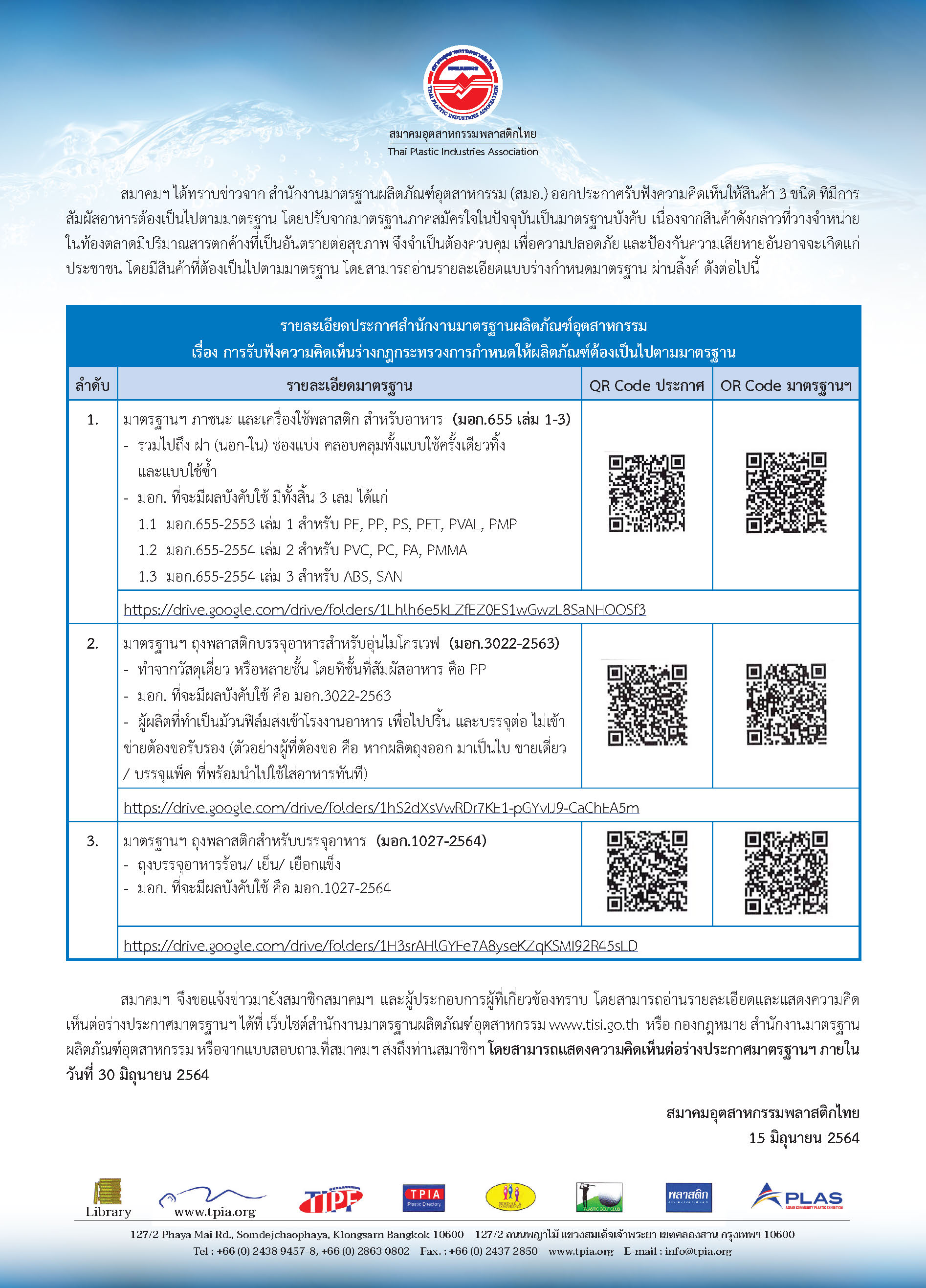 สมาคมฯ ได้ทราบข่าวจาก สำนักงานมาตรฐานผลิตภัณฑ์อุตสาหกรรม (สมอ.) ออกประกาศรับฟังความคิดเห็นให้สินค้า 3 ชนิด ที่มีการสัมผัสอาหารต้องเป็นไปตามมาตรฐาน โดยปรับจากมาตรฐานภาคสมัครใจในปัจจุบันเป็นมาตรฐานบังคับ เนื่องจากสินค้าดังกล่าวที่วางจำหน่ายในท้องตลาดมีปริมาณสารตกค้างที่เป็นอันตรายต่อสุขภาพ จึงจำเป็นต้องควบคุม เพื่อความปลอดภัย และป้องกันความเสียหายอันอาจจะเกิดแก่ประชาชน โดยมีสินค้าที่เกี่ยวกับพลาสติกที่ต้องเป็นไปตามมาตรฐาน 3 ชนิด ตามรายละเอียดที่แนบมานี้
