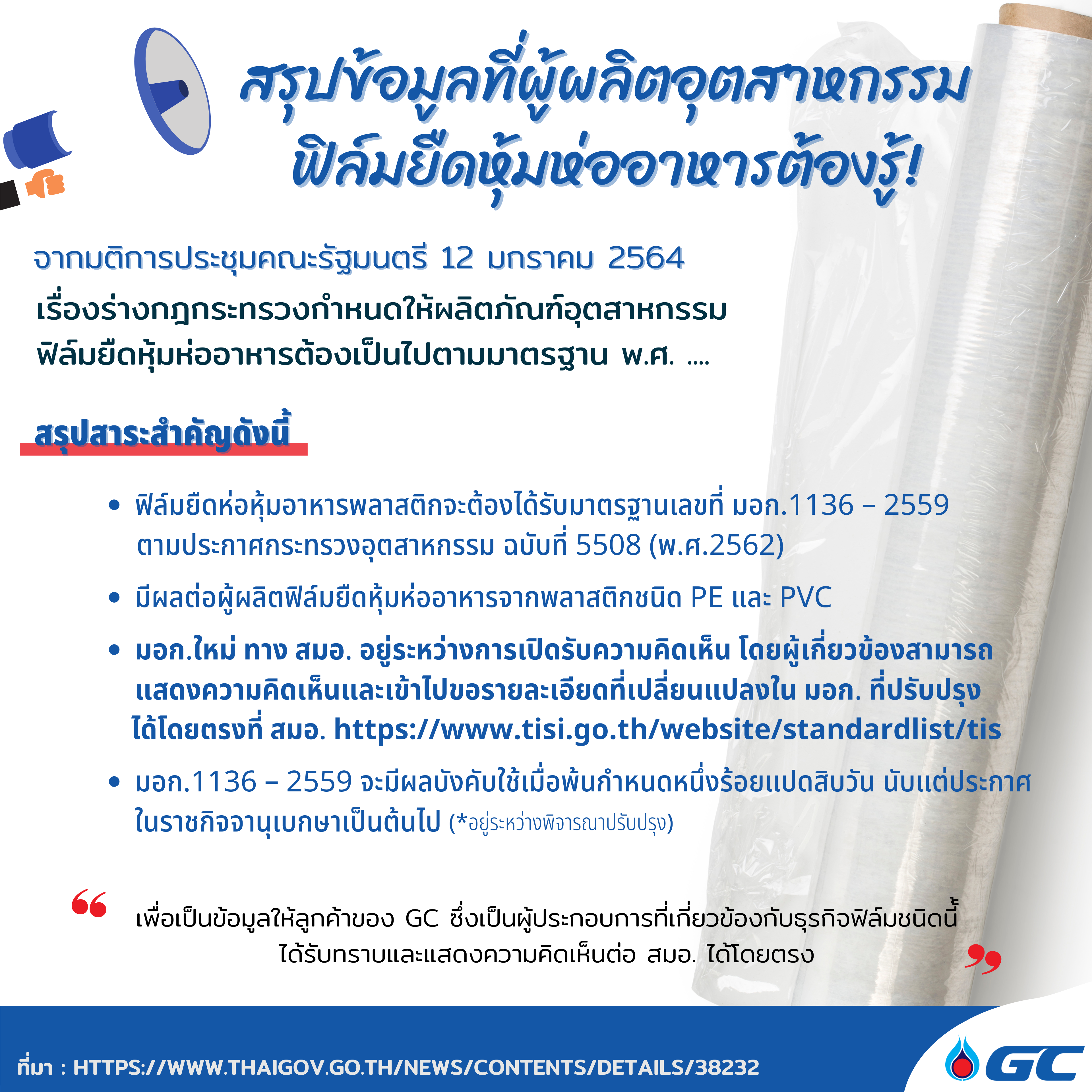 กำหนดให้ผลิตภัณฑ์อุตสาหกรรม ฟิล์มยืดหุ้มห่ออาหาร ต้องเป็นไปตามมาตรฐานเลขที่ มอก. 1136 – 2559 ตามประกาศกระทรวงอุตสาหกรรม ฉบับที่ 5508 (พ.ศ.2562) ออกตามความในพระราชบัญญัติมาตรฐานผลิตภัณฑ์อุตสาหกรรม พ.ศ. 2511 เรื่อง ยกเลิกและกำหนดมาตรฐานผลิตภัณฑ์อุตสาหกรรม ฟิล์มยืดหุ้มห่ออาหาร ประกาศ ณ วันที่ 30 กันยายน 2562 โดยให้มีผลใช้บังคับเมื่อพ้นกำหนดหนึ่งร้อยแปดสิบวันนับแต่วันประกาศในราชกิจจานุเบกษาเป็นต้นไป