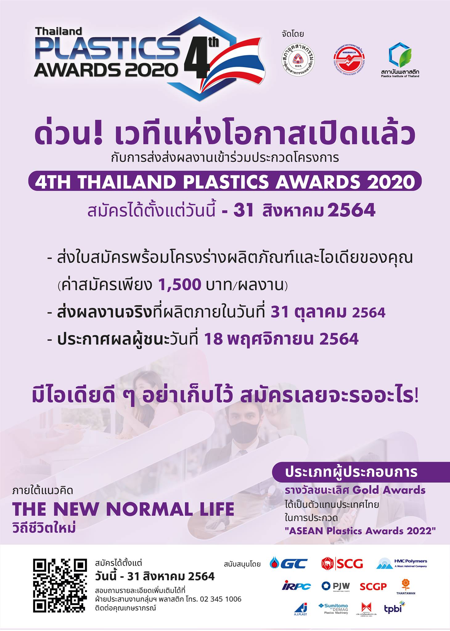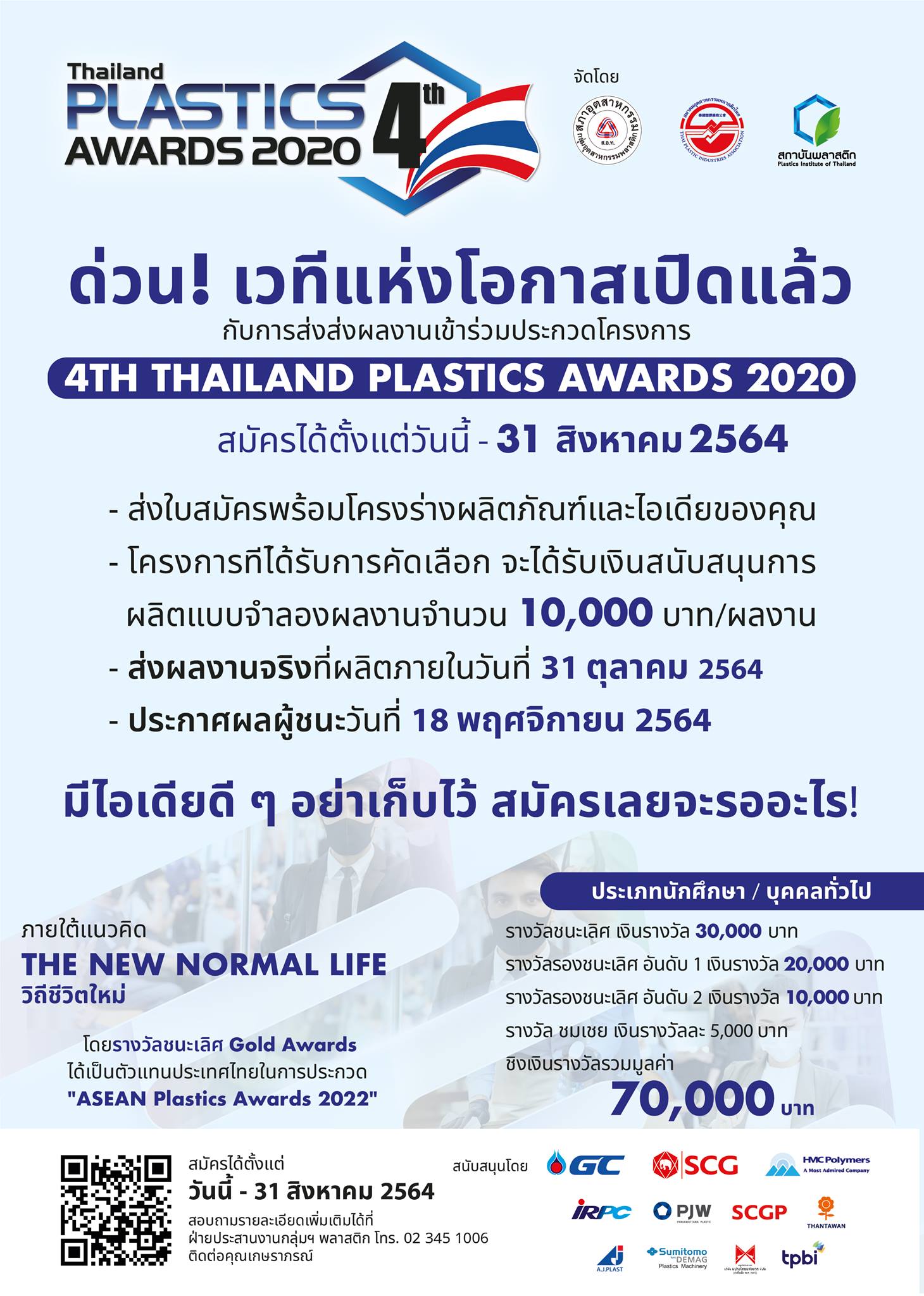 สมาคมอุตสาหกรรมพลาสติกไทย กลุ่มอุตสาหกรรมพลาสติก สภาอุตสาหกรรมแห่งประเทศไทย และสถาบันพลาสติก ขอเชิญชวนผู้ประกอบการ นักศึกษา และบุคคลทั่วไป ส่งผลงานประกวดผลิตภัณฑ์พลาสติกอย่างรับผิดชอบต่อสังคมและสิ่งแวดล้อม ปีที่ 4 "Thailand Plastic 4th Awards 2020" ชิงรางวัลชนะเลิศ เป็นตัวแทนประเทศไทยไปประกวดในเวที “ASEAN Plastics Awards 2022” ภายใต้แนวคิด The New Normal Life