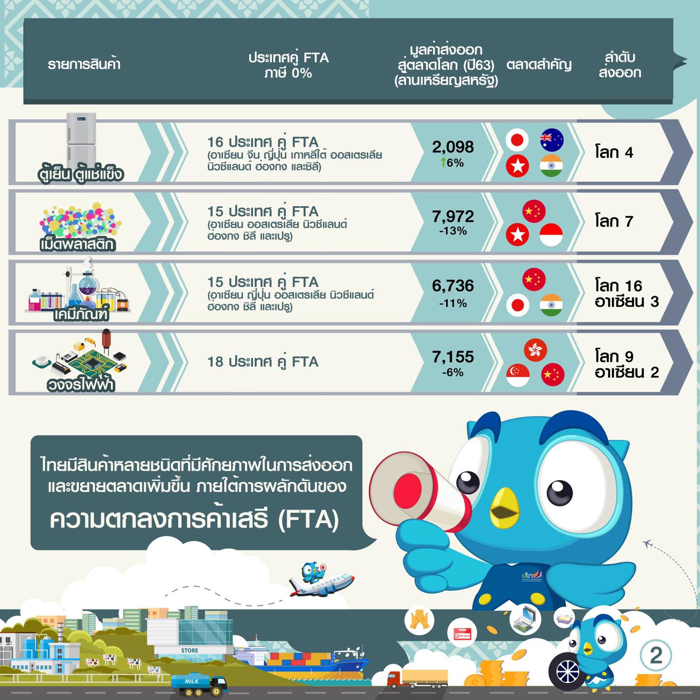 รู้หรือไม่ นอกจากสินค้าเกษตรของไทยที่มีศักยภาพในการส่งออกติดอันดับต้นๆ ของโลก สินค้าอุตสาหกรรมของไทยก็มีศักยภาพสูง สามารถแข่งขันกับสินค้าจากนานาประเทศได้เช่นกัน มาดูกันว่า สินค้าอุตสาหกรรมประเภทใดบ้างที่มีศักยภาพส่งออก และใช้ประโยชน์จากความตกลงการค้าเสรี (FTA) ที่ไทยทำกับ 18 ประเทศ เพิ่มความได้เปรียบทางการค้า