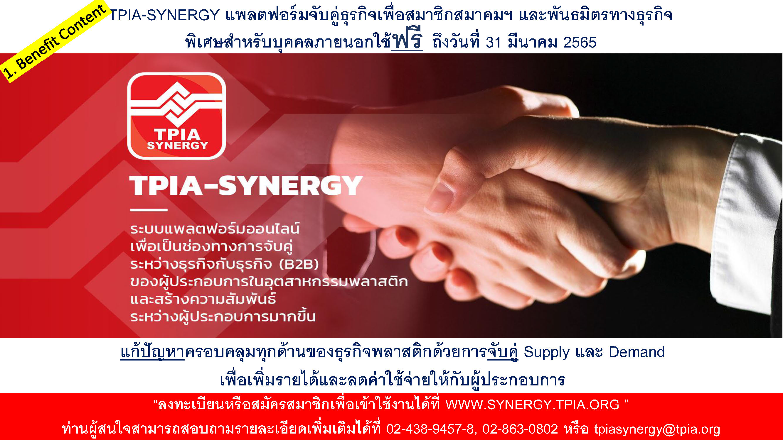 TPIA-SYNERGY คือ ระบบแพลตฟอร์ม Ecosystem ออนไลน์ สร้างโดยสมาคมอุตสาหกรรมพลาสติกไทย วัตถุประสงค์เพื่อจับคู่ธุรกิจระหว่างผู้ประกอบการในกลุ่มธุรกิจพลาสติก แก้ปัญหาครอบคลุมทุกด้านของธุรกิจพลาสติกด้วยการจับคู่ Supply และ Demand เพื่อเพิ่มรายได้และลดค่าใช้จ่ายให้กับผู้ประกอบการ และเป็นช่องทางติดตามข่าวสารของวงการพลาสติก