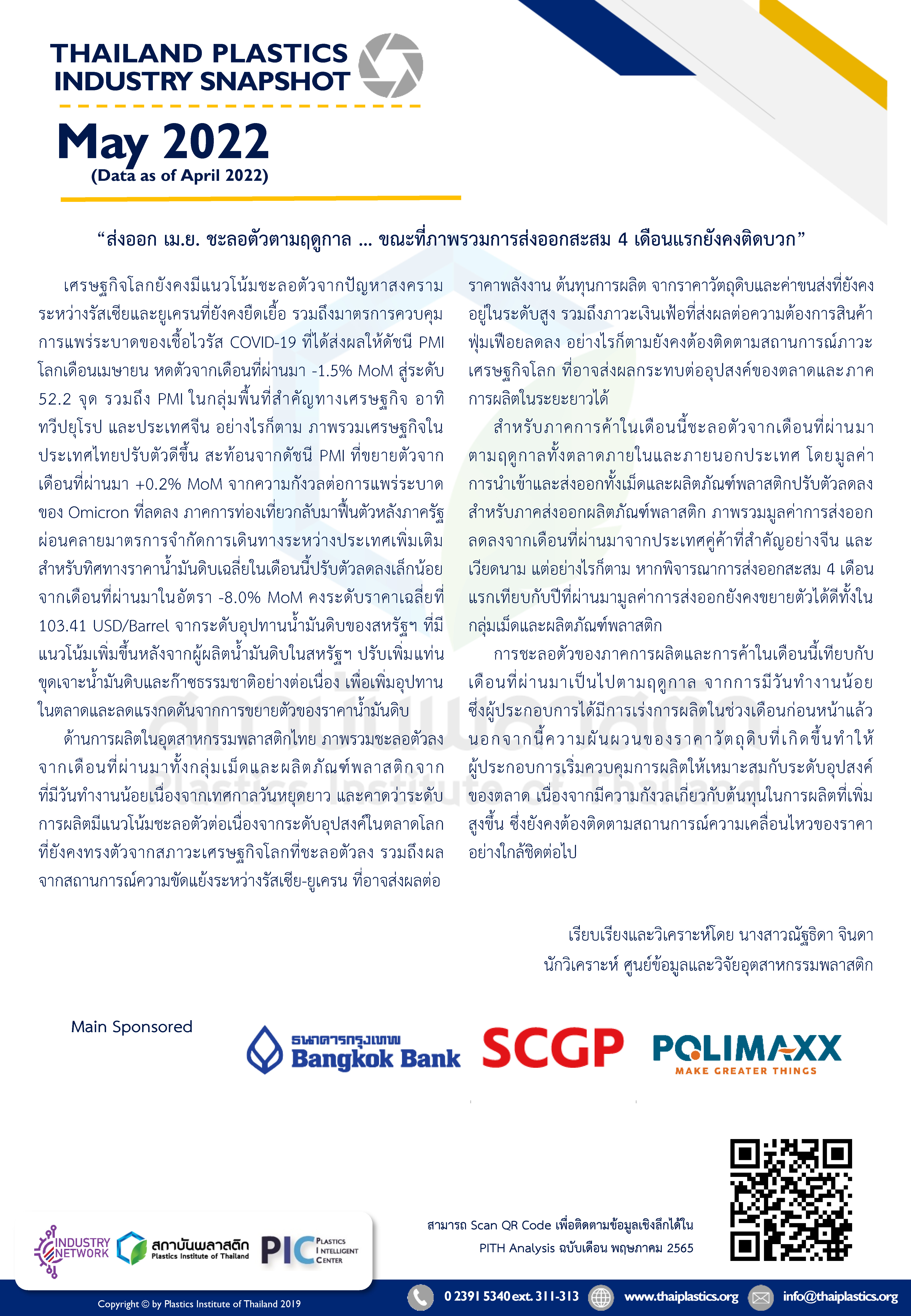 อัพเดทสถานการณ์อุตสาหกรรมพลาสติกประจำเดือน พฤษภาคม 2565 ข้อมูลเดือน เมษายน 2565 และภาวะอุตสาหกรรมสำคัญในอุตสาหกรรมพลาสติกไทย