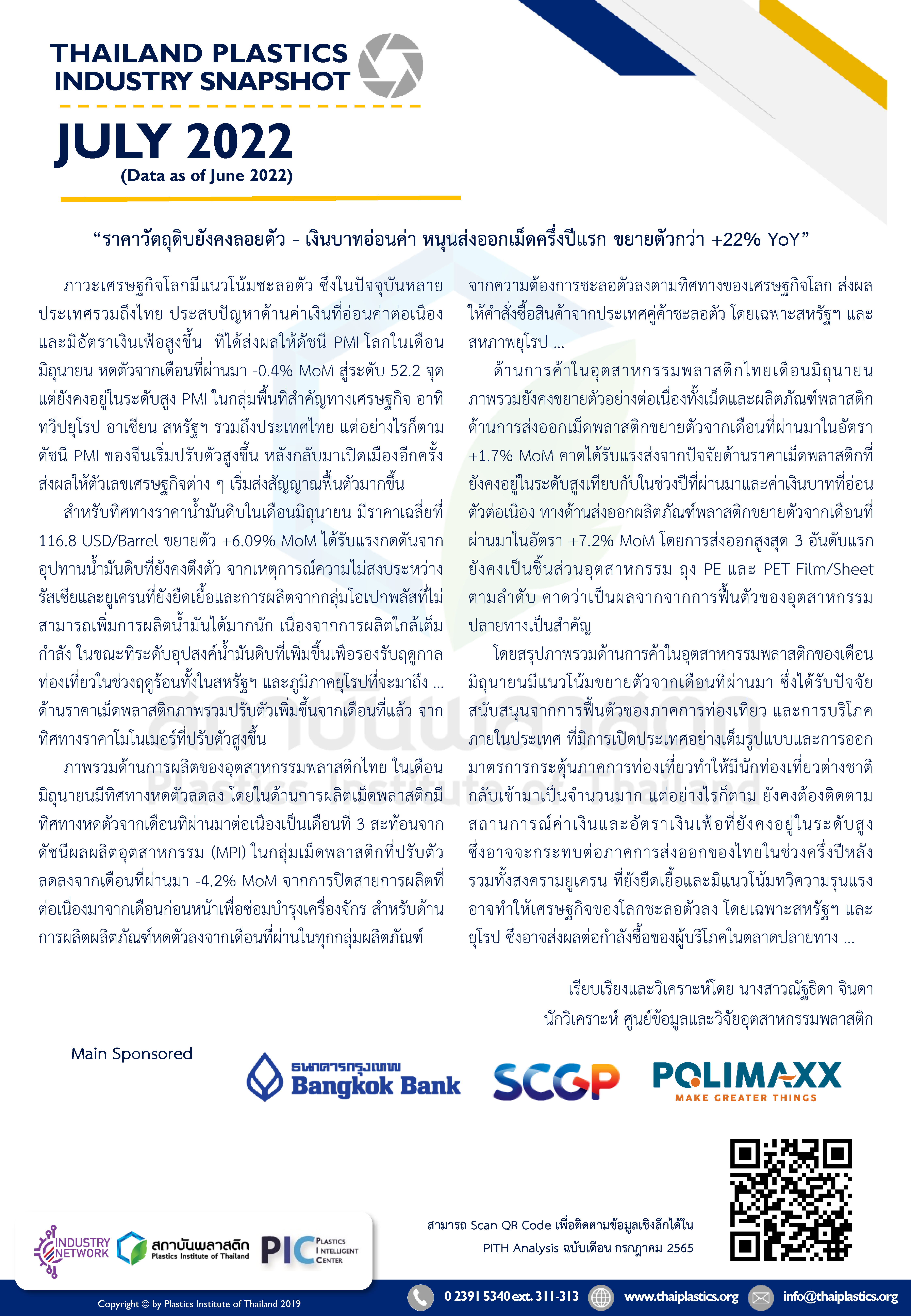 อัพเดทสถานการณ์อุตสาหกรรมพลาสติกประจำเดือน กรกฏาคม 2565 ข้อมูลเดือน มิถุนายน 2565 และภาวะอุตสาหกรรมสำคัญในอุตสาหกรรมพลาสติกไทย