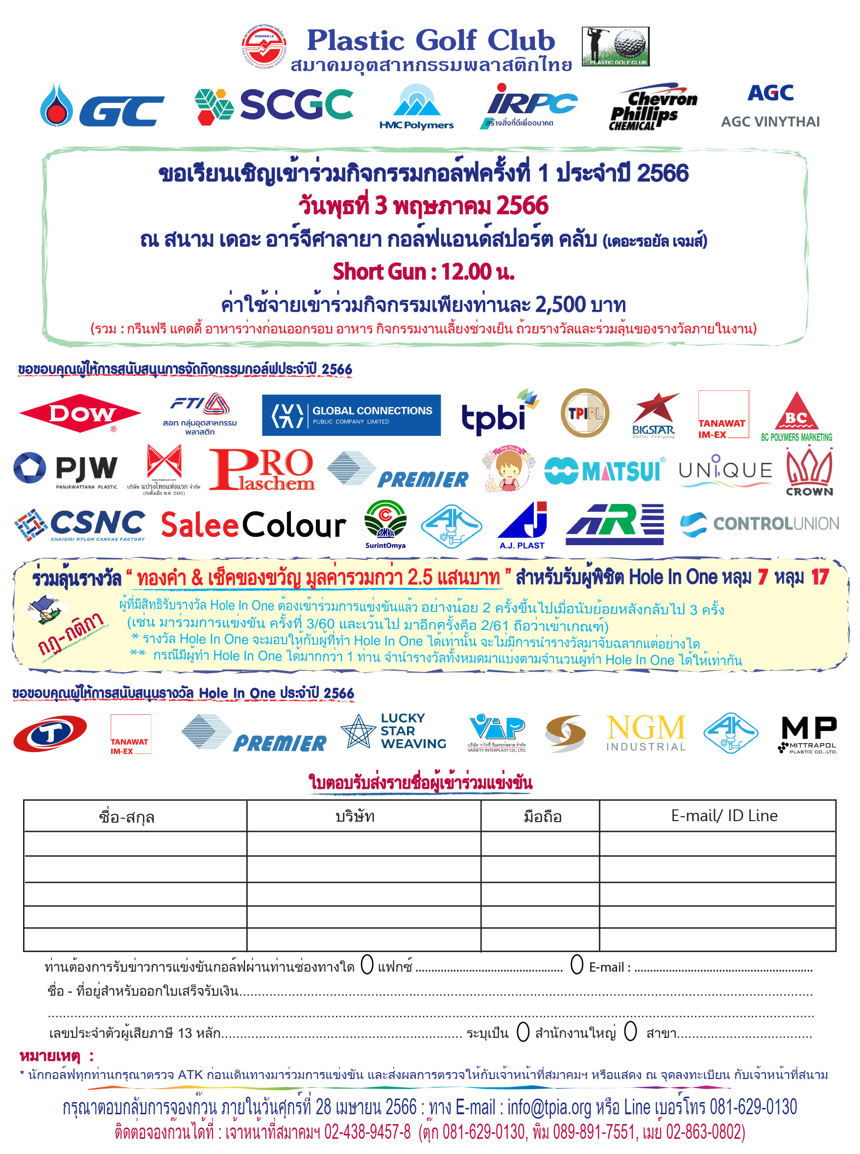 สมาคมอุตสาหกรรมพลาสติกไทยขอเรียนเชิญร่วมกิจกรรมการแข่งขันกอล์ฟครั้งที่ 1/2566 ในวันพุธที่ 3 พฤษภาคม 2566 ณ สนาม เดอะ อาร์จีศาลายา กอล์ฟแอนด์สปอร์ต คลับ (เดอะรอยัล เจมส์ ศาลายา)