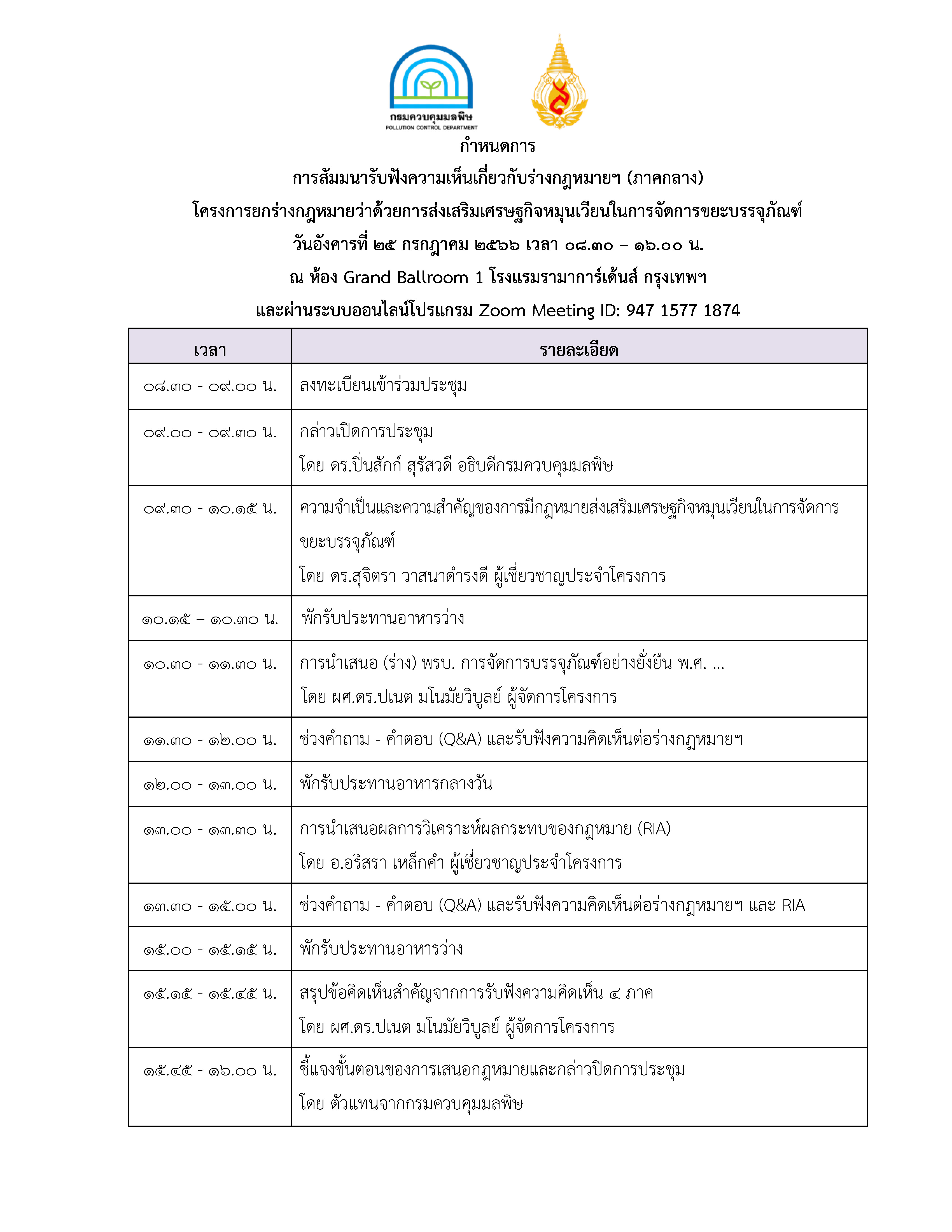 ขอเรียนเชิญเข้าร่วมการสัมมนารับฟังความเห็นเกี่ยวกับร่างกฎหมายว่าด้วยการส่งเสริมเศรษฐกิจหมุนเวียนในการจัดการขยะบรรจุภัณฑ์ (ภาคกลาง)