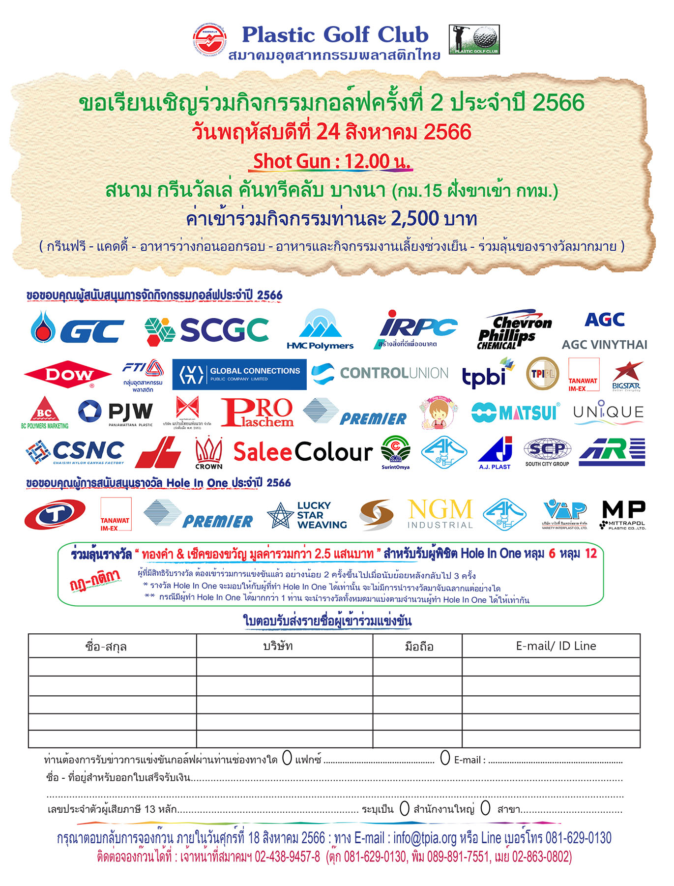 สมาคมอุตสาหกรรมพลาสติกไทย ขอเรียนเชิญท่านสมาชิกและผู้ประกอบการอุตสาหกรรมพลาสติก เข้าร่วมกิจกรรมการแข่งขันกอล์ฟ ครั้งที่ 2/2566